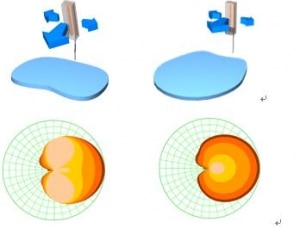 機械下傾(左)與電子下傾(右)覆蓋區域形狀對比