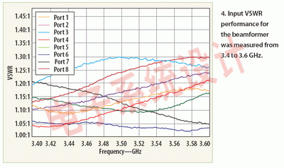 為展示該設計方法,設計了一個用于3.4到3.6GHz頻段的四束天線波束成型器。用安捷倫科技的(www.agilent.com)N5230A矢量網絡分析儀對其性能進行了測量,N5230A在工作時與同樣來自安捷倫的也工作在3.4到3.6GHz范圍的U3042A多口測試裝置連接。圖3、圖4和圖5顯示的是基于該設計方法的典型八波束波束成型網絡的結果。